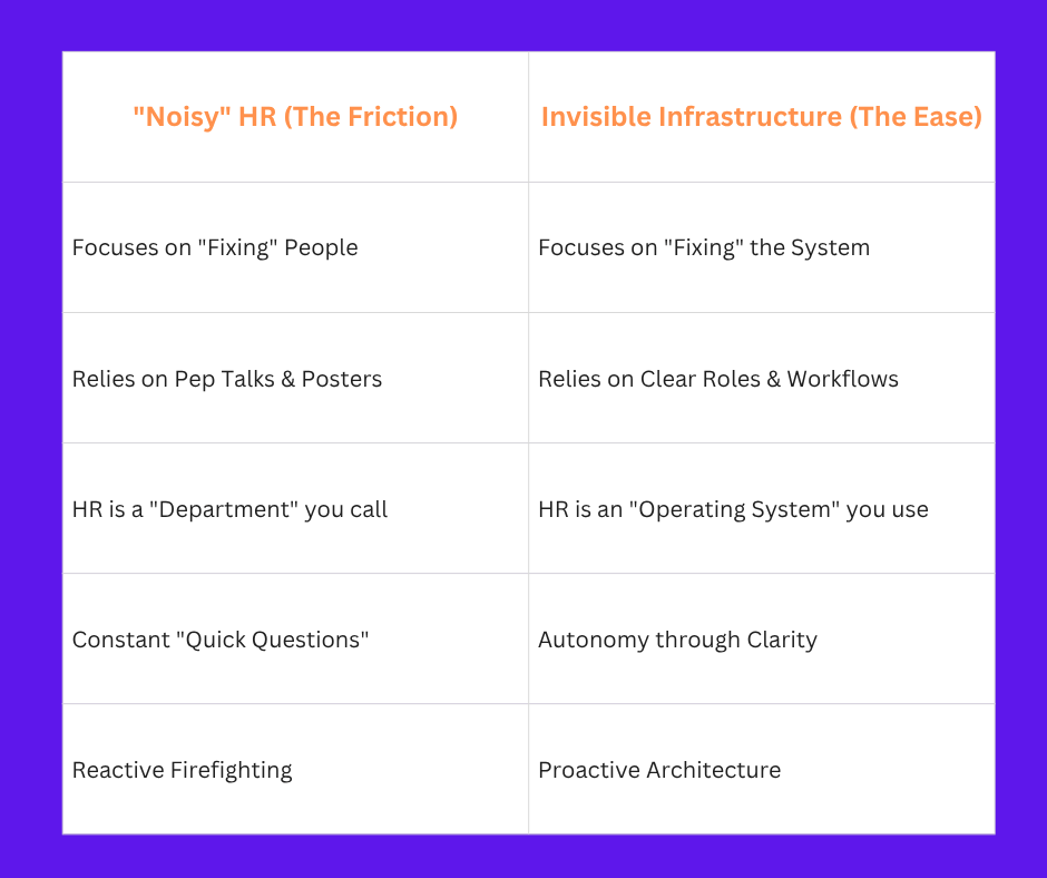 The shift from Noisy HR to Invisible Infrastructure requires moving from a "Firefighter" mindset to an "Architect" mindset. It means stopping the cycle of reactive fixes and building a People Operating System that scales.